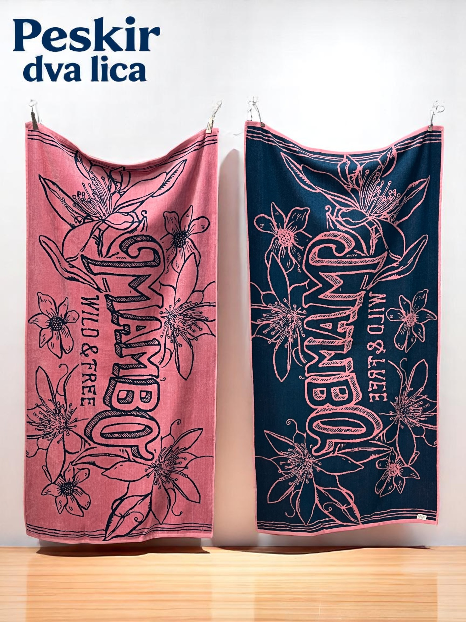Izdvojite se na plaži ili bazenu uz luksuzni peškir MAMBO Wild & Free dimenzija 83×160 cm, dizajniran sa dve upečatljive strane. Jedna strana dolazi u elegantnoj rozoj boji sa tamnim cvetnim motivima, dok druga kombinuje tamnoplavu podlogu sa roze detaljima – savršen za promenu stila u sekundi!